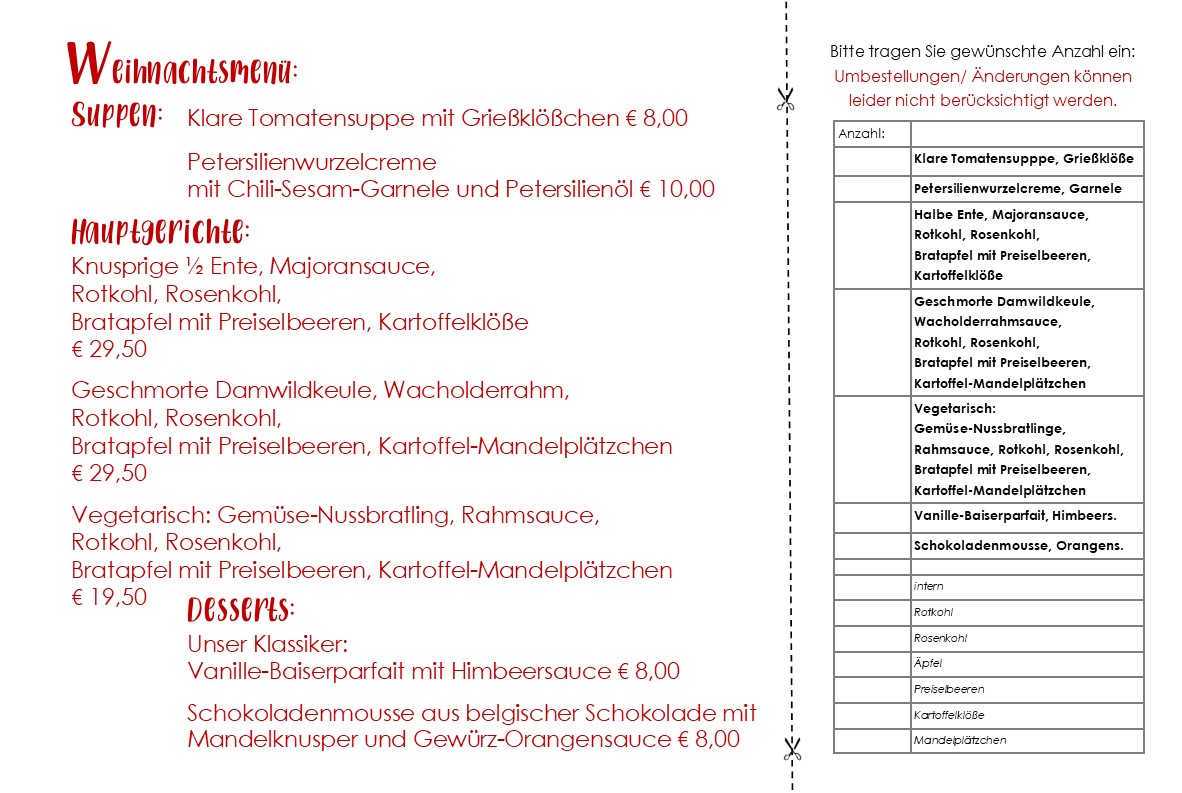 Eine Liste der Allergene und Zusatzstoffe kann bei der Bestellung in unserer Küche eingesehen werden.
